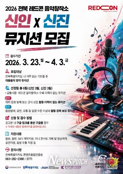 뉴스펀치 최영남 기자 | (재)전북특별자치도 콘텐츠융합진흥원은 전북 레드콘 음악창작소를 통해 전북 지역 대중음악 창작 생태계 활성화와 지역 뮤지션 육성을 위한 ‘2026 레드콘 예비·신진 뮤지션’공개 모집한다고 밝혔다.