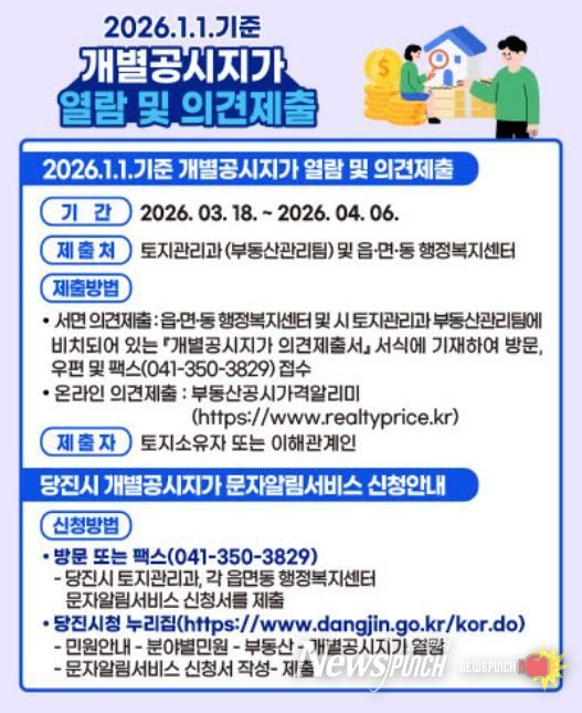 뉴스펀치 이현승 기자 | 당진시는 3월 18일부터 4월 6일까지 20일간 2026년 1월 1일 기준 관내 35만 1,199필지에 대한 개별공시지가 열람을 실시한다고 18일 밝혔다.