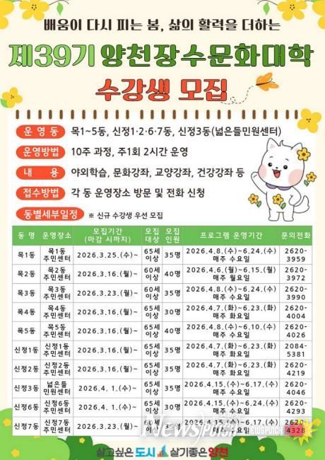 이번 제39기 장수문화대학은 4월 6일부터 6월 24일까지 목1~5동, 신정1·2·6·7동, 신정3동 넓은들민원센터 등 10개 동에서 동별 9주 과정으로 운영된다. 이후 전체 수강생이 함께하는 통합 수료식으로 마무리될 예정이다.