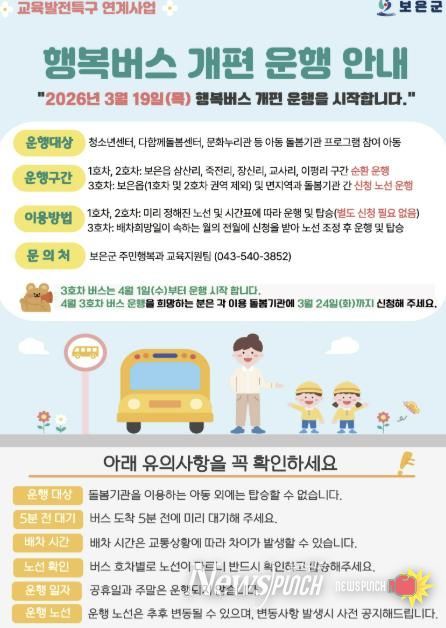 뉴스펀치 이현승 기자 | 충북 보은군은 교육발전특구사업의 일환으로 2025년 7월부터 운영 중인 ‘행복버스’를 오는 19일부터 개편 운행한다고 밝혔다.