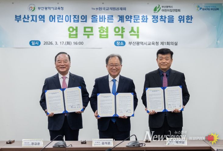 뉴스펀치 김윤걸 기자 | 부산광역시교육청은 17일 오후 교육청 회의실에서 한국교직원공제회, 부산광역시어린이집연합회와 함께 부산지역 어린이집의 올바른 계약문화 정착을 위한 업무협약을 체결했다.