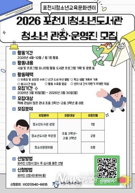 뉴스펀치 박상훈 기자 | 포천시청소년재단 포천시청소년교육문화센터는 청소년 참여형 도서관 운영을 위해 ‘2026년 포천시청소년도서관 청소년 관장 및 운영진’을 모집한다.