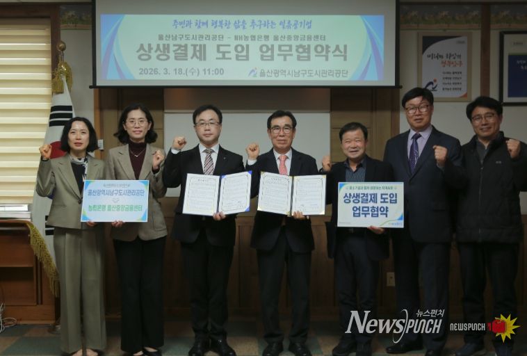 뉴스펀치 김윤걸 기자 | 울산남구도시관리공단은 18일 농협은행 울산중앙금융센터와 중소기업 상생환경 조성을 위해 상생결제 시스템 도입과 확산을 위한 업무협약을 체결했다.
