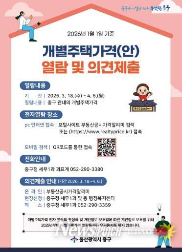 뉴스펀치 김윤걸 기자 | 울산 중구가 2026년 1월 1일 기준 개별주택가격을 공개하고, 3월 18일부터 4월 6일까지 주택 소유자와 이해 관계인의 의견을 청취한다.