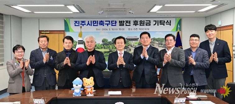 뉴스펀치 박세훈 기자 | 진주시는 18일 진주시청 기업인의 방에서 NH농협 진주시지부와 경남은행의 ‘진주시민축구단 발전을 위한 후원금 전달식’을 개최했다고 밝혔다.
