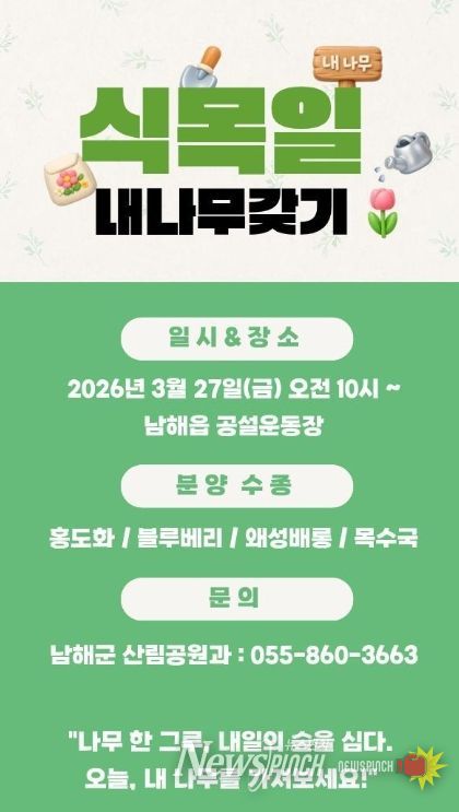 뉴스펀치 박세훈 기자 | 남해군은 제81회 식목일을 맞아 오는 27일 오전 10시부터 남해읍 공설운동장에서 ‘내나무갖기 캠페인’을 진행한다.