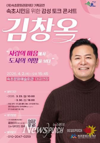 뉴스펀치 조평훈 기자 | (재)속초문화관광재단은 오는 4월 2일 오후 3시 45분 속초문화예술회관 대공연장에서 기획공연 속초시민을 위한 감성 토크콘서트 김창옥 초청 강연을 개최한다.