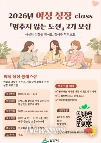 뉴스펀치 박세훈 기자 | 경남 밀양시는 여성친화도시 조성의 일환으로, 여성의 사회참여 확대와 리더십 역량 강화를 위한 2026년 여성 성장 class ‘멈추지 않는 도전’ 제2기 수강생을 모집한다.