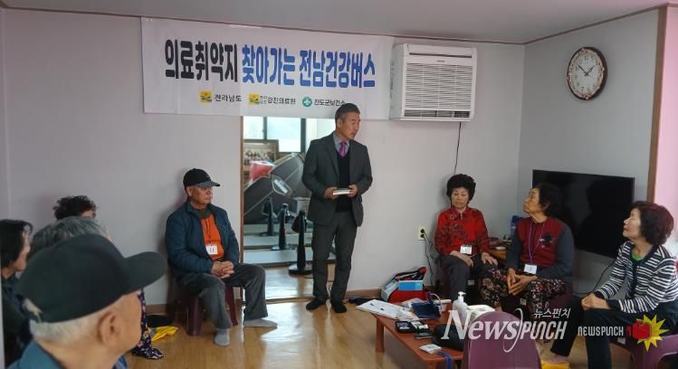 뉴스펀치 손석남 기자 | 진도군은 의료기관에 대한 접근성이 낮은 농어촌 지역 주민들의 건강관리를 위해 순회진료 사업의 하나로 ‘찾아가는 전남건강버스’를 통해 맞춤형 의료서비스를 추진했다.