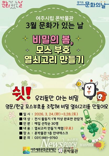 뉴스펀치 박상훈 기자 | 여주세종문화관광재단이 운영하는 여주시립 폰박물관은 3월 '문화가 있는 날'을 맞아 오는 24일부터 28일까지 5일간 시민 참여형 행사 ‘비밀의 봄, 모스부호 열쇠고리 만들기’를 운영한다.