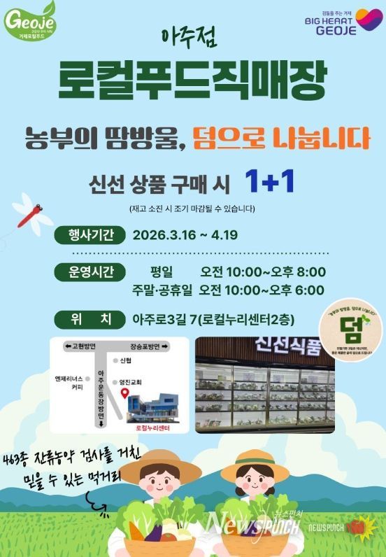 뉴스펀치 박세훈 기자 | 거제시는 지난 16일부터 오는 4월 19일까지 약 1개월간 거제로컬 누리센터 아주점에서 농가의 재고 부담을 덜고 소비자에게는 혜택을 제공하는 『농부의 땀방울, 덤(1+1)으로 나눕니다』 행사를 시범 운영한다고 밝혔다.