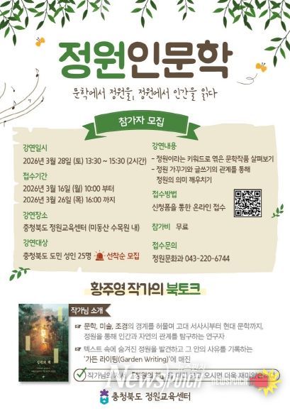 뉴스펀치 이현승 기자 | 충청북도 정원교육센터가 정원을 매개로 한 신체적·정신적 활동과 인문학적 탐색을 통해 도민들의 생태 감수성을 함양하고 인문학적 정원 문화를 정착시키고자 ‘정원인문학(문학 속 정원 읽기)’ 교육을 운영한다.