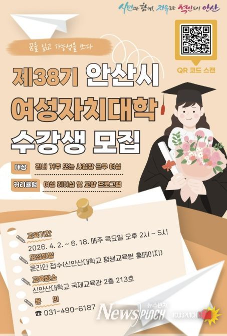 뉴스펀치 박상훈 기자 | 안산시는 지역 여성의 역량 강화와 리더십 함양을 위한 ‘제38기 안산시 여성자치대학’ 수강생을 모집한다고 20일 밝혔다.