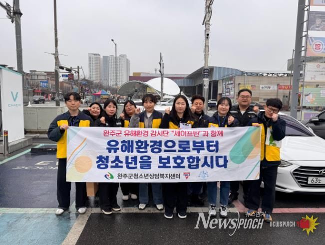 뉴스펀치 정홍균 기자 | 완주군과 완주군청소년유해환경감시단 ‘세이프틴’(완주군청소년상담복지센터)이 새 학기를 맞아 최근 삼례시장과 삼례중학교 일대에서 청소년 유해환경 개선을 위한 민·관 합동 점검 및 단속을 실시했다.