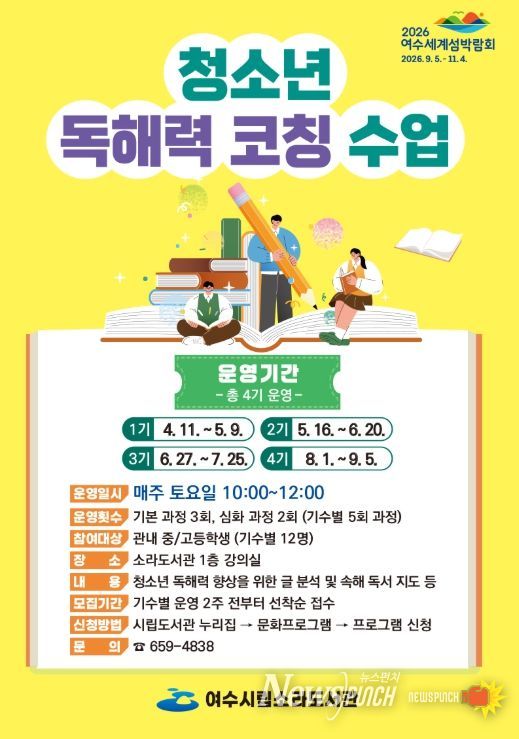 뉴스펀치 김용희 기자 | 여수시는 오는 4월 11일부터 관내 중·고등학생을 대상으로 ‘청소년 독해력 코칭 수업’ 프로그램을 운영한다고 밝혔다.