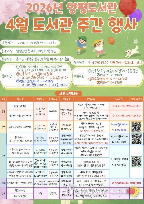 뉴스펀치 박상훈 기자 | 양평군은 제62회 도서관의 날·도서관 주간(4월 12일~4월 18일)을 맞아 양평도서관에서 어린이부터 성인까지 전 연령층이 참여할 수 있는 공연, 강연, 체험 등 다채로운 행사를 운영한다.
