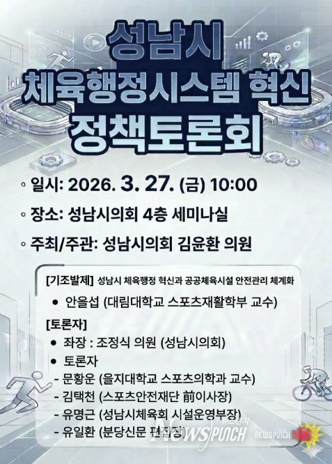 뉴스펀치 박상훈 기자 | 성남시의회 김윤환 의원(문화복지체육위원회)은 오는 27일, 성남시 체육행정의 혁신 방향을 모색하기 위한 '성남시 체육행정시스템 혁신 정책토론회'를 개최한다고 밝혔다.