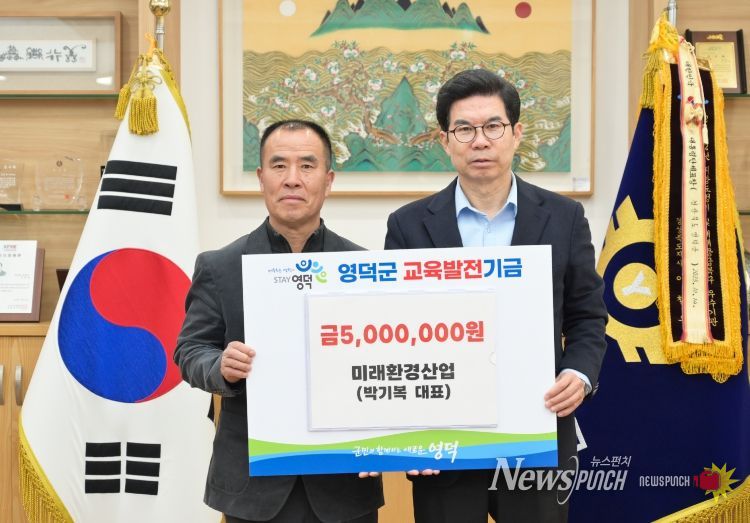 뉴스펀치 박세훈 기자 | 영덕군 지역 건설업체인 ㈜미래환경산업 박기복 대표가 지난 19일 김광열 영덕군수를 만나 지역 인재 육성에 써달라며 교육 발전 기금 500만 원을 기탁했다.