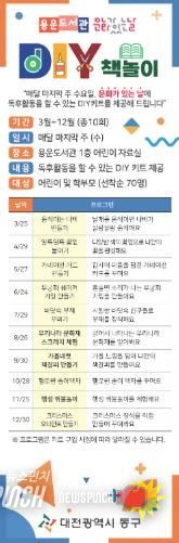 뉴스펀치 이현승 기자 | 대전 동구는 매달 마지막 주 수요일 ‘문화가 있는 날’을 맞아, 이달 25일부터 용운도서관에서 ‘DIY 책놀이’ 프로그램을 운영한다고 20일 밝혔다.