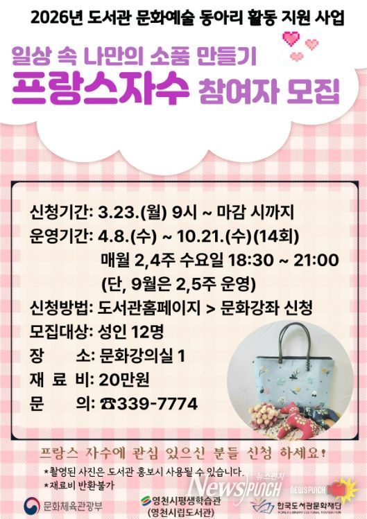 뉴스펀치 박세훈 기자 | 영천시 평생학습관은 지역 주민을 대상으로 ‘프랑스 자수’ 문화예술 동아리를 운영한다고 밝혔다.