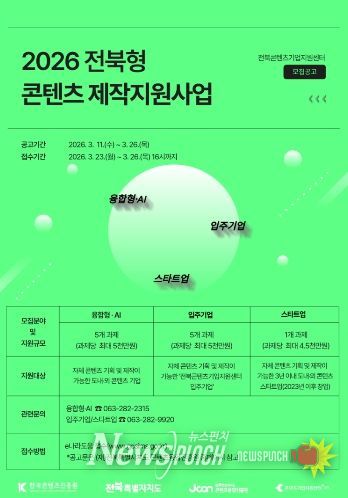 뉴스펀치 최영남 기자 | 전북도의 콘텐츠와 ICT 융합산업 육성을 이끌어가는 (재)전북특별자치도 콘텐츠융합진흥원에서 도내 콘텐츠 기업의 경쟁력 강화와 콘텐츠산업 활성화를 위해 ‘2026 전북형 콘텐츠 제작지원사업’과 ‘2026 콘텐츠 고도화 지원사업’ 참여기업을 모집한다고 밝혔다.