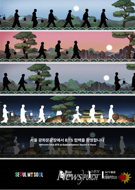 뉴스펀치 박상훈 기자 | 20일 금요일 저녁 7시, 방탄소년단 멤버 전원이 등장하는 영상이 광화문광장 일대에 ‘깜짝’ 등장한다. 서울시는 3월 20일 오후 7시부터 방탄소년단 컴백쇼 당일인 21일 밤 12시까지 광화문광장 주변 건물 대형 옥외전광판 10곳에서 방탄소년단 컴백 관련 영상과 환영 메시지(한국어, 영어)를 송출한다고 밝혔다. 글로벌 최초 공개다.