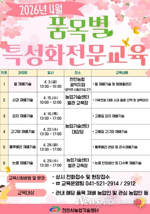 뉴스펀치 강영선 기자 | 천안시농업기술센터는 내달 3~ 29일 ‘품목별 특성화 전문교육’을 운영한다고 23일 밝혔다.