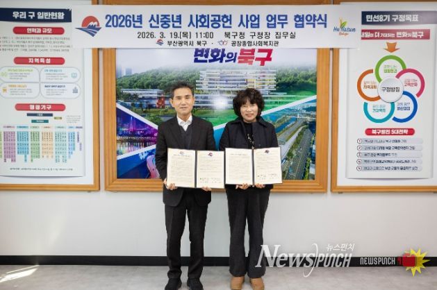 뉴스펀치 김윤걸 기자 | 부산 북구는 지난 19일 사회적 가치 실현을 위한 ‘신중년 사회공헌사업’ 추진을 위해 공창종합사회복지관과 업무협약을 체결했다.