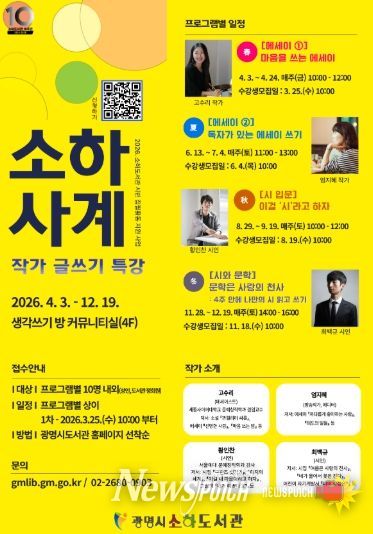 뉴스펀치 박상훈 기자 | 광명시 소하도서관이 오는 25일부터 전문 작가와 함께하는 글쓰기 강좌 ‘소하사계’ 봄 특강 참여자를 모집한다.