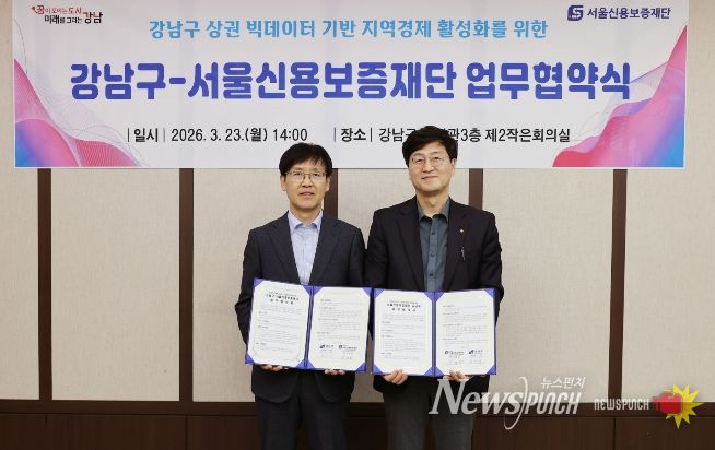 뉴스펀치 박상훈 기자 | 꿈이 모이는 도시, 미래를 그리는 강남구가 3월 23일 구청에서 서울신용보증재단과 업무협약을 체결하고, 지역상권 활성화와 소상공인 지원을 위한 빅데이터 기반 협력체계 구축에 나섰다. 상권 현황을 보다 정밀하게 분석해 지역 특성에 맞는 정책을 발굴하고, 소상공인이 체감할 수 있는 지원책으로 연결하겠다는 취지다.