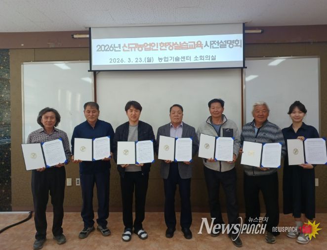 뉴스펀치 강영선 기자 | 증평군농업기술센터는 지난 23일 귀농 연수생 및 선도 농가와 2026년 신규농업인 현장실습 교육 약정서를 체결하고 사전교육을 진행했다고 밝혔다.