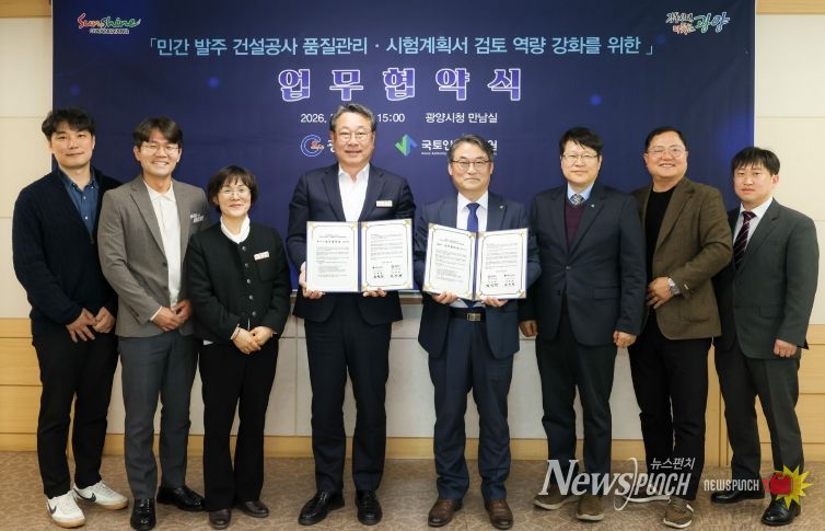 뉴스펀치 김용희 기자 | 광양시는 23일 오후 3시 광양시청 본청 2층 만남의실에서 국토안전관리원과 민간 발주 건설공사 품질관리·시험계획서 검토 지원 시범운영을 위한 업무협약을 체결했다고 밝혔다.