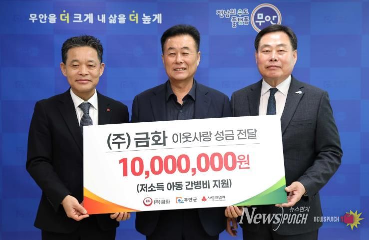 뉴스펀치 김용희 기자 | 무안군은 지난 23일 도계·육가공 전문업체인 ㈜금화가 전문가정위탁으로 보호 중인 질병아동의 간병비 지원을 위해 매월 100만 원을 지정 기탁한다고 밝혔다.