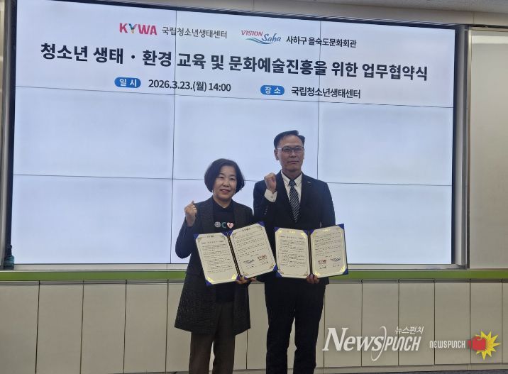 뉴스펀치 김윤걸 기자 | 사하구 을숙도문화회관(관장 박미혜)은 한국청소년활동진흥원이 운영하는 국립청소년생태센터(원장 오재법)와 지난 3월 23일 청소년 문화 예술 활성화를 위한 업무협약(MOU)을 체결했다고 밝혔다.