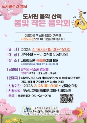 김정남 사하도서관장은 “이번 공연이 아름다운 악기의 선율과 함께 봄을 느낄 수 있는 시간이 되길 바란다”며 “앞으로도 시민들이 함께 즐길 수 있는 다양한 문화 프로그램을 지속적으로 운영하겠다”고 말했다.