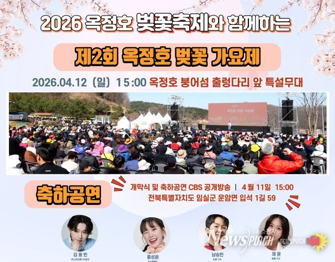 축제 첫날인 4월 11일 오후3시 개막식에는 웅장한 브라스밴드 공연과 CBS 주최 축하 공개방송이 열리며, ‘미스터트롯 3’ 최종 우승자 김용빈을 비롯해 TOP6 출신 남승민, ‘미스트롯 4’ 3위 홍성윤, 채윤 등 초호화 스타들이 출연해 옥정호의 봄을 화려하게 수놓는다.