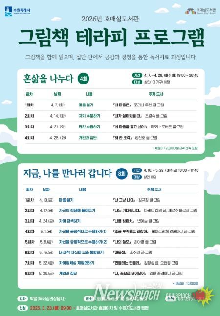 호매실도서관은 4월부터 10월까지 총 20회 그림책 인문치유프로그램 ‘그림책테라피’도 운영한다. 전문 독서심리상담사와 함께 그림책을 읽고 소통하며 정서 회복과 관계 회복을 돕는다.