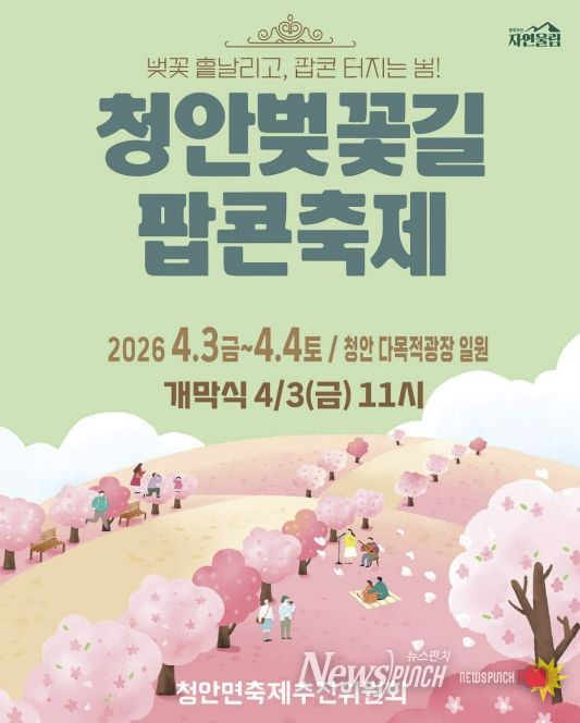 뉴스펀치 이현승 기자 | 충북 괴산군은 청안면축제추진위원회 주최로 오는 4월 3일부터 4일까지 이틀간 청안다목적광장 일원에서 ‘2026 청안벚꽃길팝콘축제’를 개최한다고 26일 밝혔다.