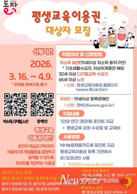 뉴스펀치 박상훈 기자 | 동작구는 지역주민의 평생교육 참여 확대와 학습 역량 강화를 위해 ‘2026년 평생교육이용권 지원사업’을 추진한다고 밝혔다.