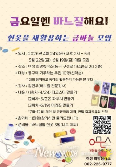 뉴스펀치 김용희 기자 | 광주 동구는 헌옷을 이용해 생활소품을 만드는 새활용 프로그램 ‘금요일엔 바느질해요! 헌옷을 새활용하는 금바늘 모임’ 참가자를 모집한다.
