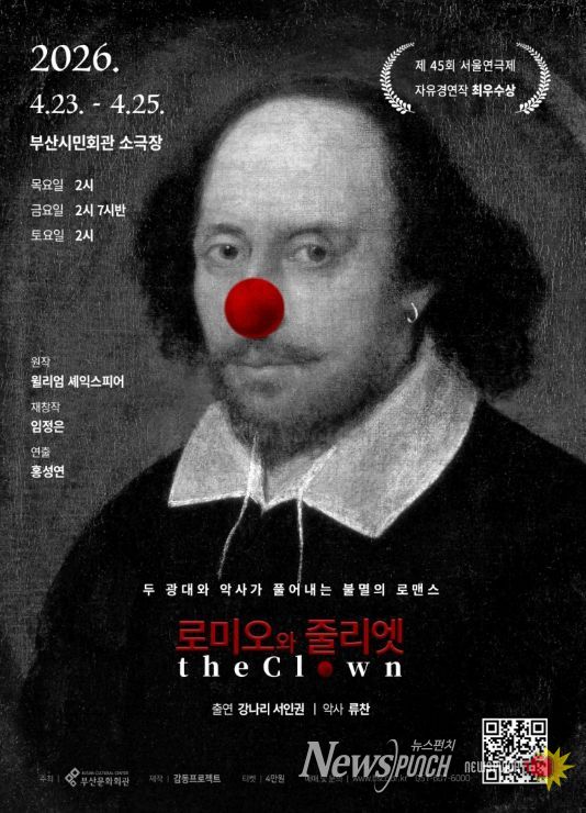 뉴스펀치 김윤걸 기자 | (재)부산문화회관(대표이사 차재근)은 오는 4월 23일부터 25일까지 3일간 부산시민회관 소극장에서 연극 '로미오와 줄리엣 The Clown〉을 선보인다. 이 작품은 2024년 제45회 서울연극제 자유경연작 최우수상 수상작으로 예술성과 완성도를 동시에 인정 받으며 관객과 평단의 호평을 받은 작품이다.