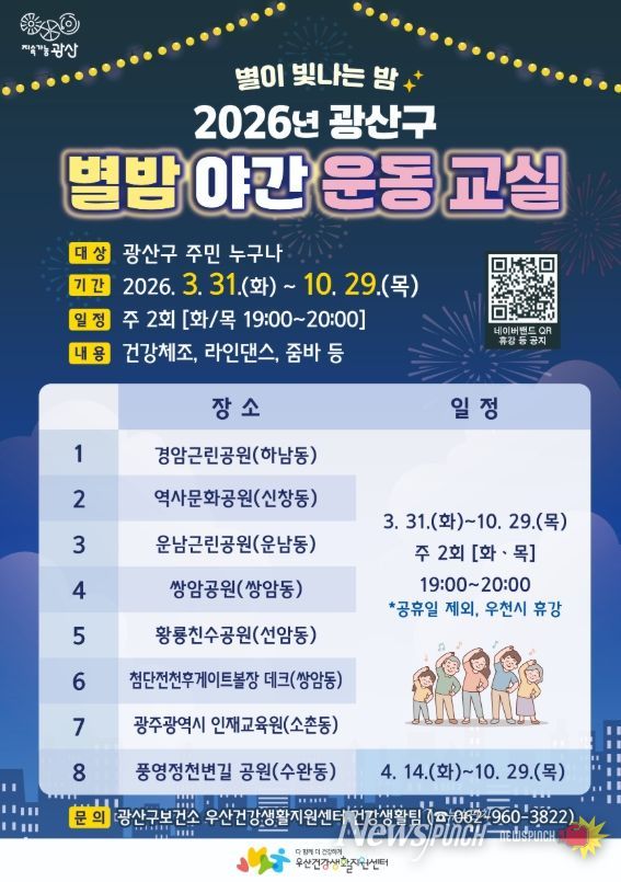 뉴스펀치 김용희 기자 | 광주 광산구가 건강한 신체활동 환경을 조성하고 지역 주민들이 규칙적인 운동습관 형성을 위해 ‘별밤야간운동교실’을 운영한다.