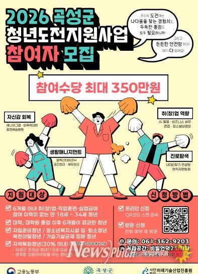 뉴스펀치 김용희 기자 | 전남 곡성군이 구직 과정에서 지친 청년들의 자신감 회복과 사회 진입을 돕기 위한 ‘2026년 청년도전지원사업’을 본격 추진하고, 참여자를 모집한다고 26일 밝혔다.