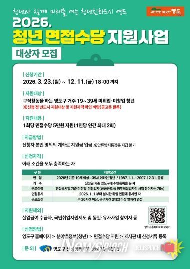 뉴스펀치 김윤걸 기자 | 부산 영도구가 미취업 청년들의 구직 활동을 실질적으로 돕기 위해 ‘2026년 청년 면접수당 지원사업’을 시행한다.