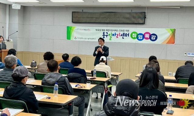 뉴스펀치 조평훈 기자 | 인천 동구는 지난 26일 주민행복센터에서 지역 중장년 구직자 35명을 대상으로 ‘100세 시대 커리어 로드맵:새로운 일의 발견’ 특강을 성황리 마무리했다고 밝혔다.