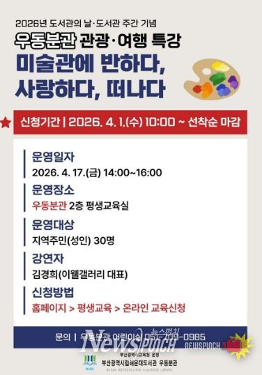 뉴스펀치 김윤걸 기자 | 부산광역시립해운대도서관은 도서관의 날・도서관주간을 맞아 4월 17일 해운대도서관 우동분관에서 지역주민 30명을 대상으로 관광·여행 특강 ‘미술관에 반하다, 사랑하다, 떠나다’를 운영한다.