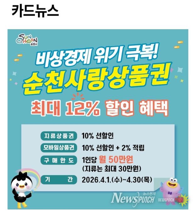 뉴스펀치 최영남 기자 | 순천시가 최근 중동 사태 등 대외 불확실성에 따른 생활물가 상승으로 어려움을 겪는 시민과 소상공인의 생활경제 안정을 위해 4월 한 달간 순천사랑상품권 할인행사를 추진한다고 밝혔다.