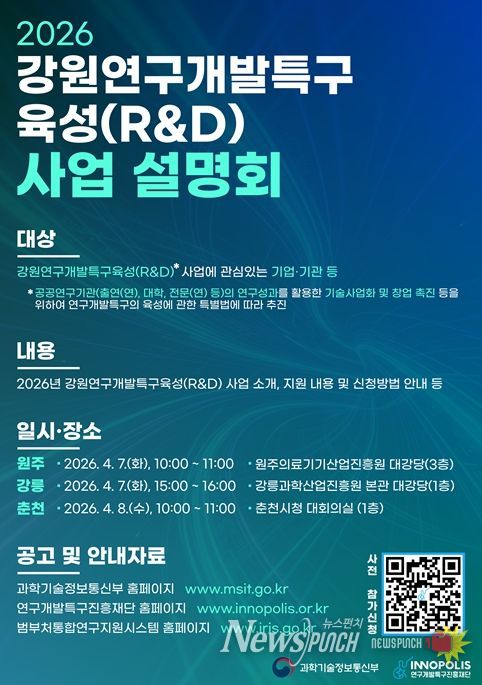 뉴스펀치 조평훈 기자 | 연구개발특구진흥재단과 강원특별자치도는 ‘2026년 강원연구개발특구육성(R·D) 사업 설명회’를 4월 7일 원주·강릉, 8일 춘천에서 개최한다고 밝혔다.