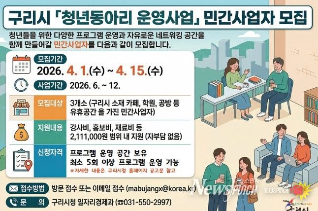 뉴스펀치 박상훈 기자 | 구리시는 4월 1일부터 청년들의 자율적이고 창의적인 활동을 지원하기 위한 ‘구리시 청년동아리’를 운영할 민간사업자를 모집한다고 밝혔다.