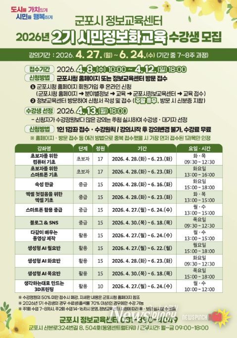 수강신청은 2026년 4월 8일 오전 10시부터 4월 12일 오후 6시까지 가능하며, 군포시청 홈페이지 또는 군포시 정보교육센터(산본로324번길 8, 504호, 주말 휴무) 방문을 통해 신청할 수 있다.